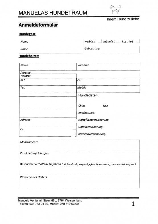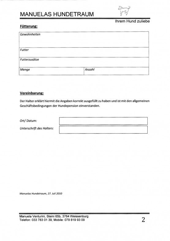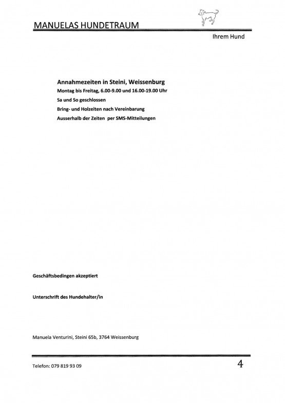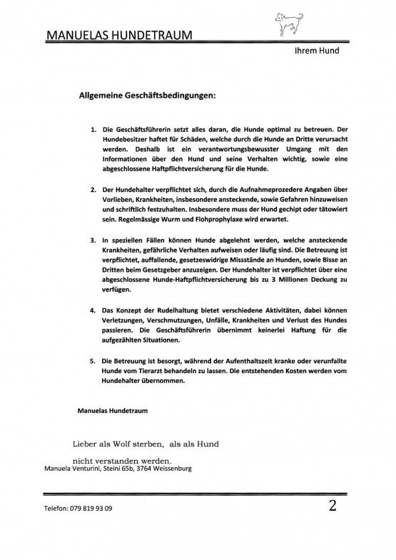 - Betreuung (Dogsitting): 5 Tage pro Woche (keine Zwinger)